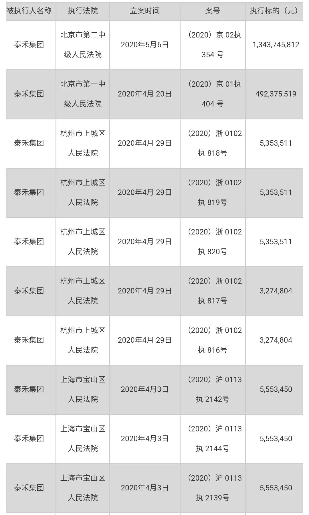 截至目前,泰禾被列为被执行人的执行标的累计金额18.97亿元。2020年以来,泰禾被列为被执行人共10起,详情如下: