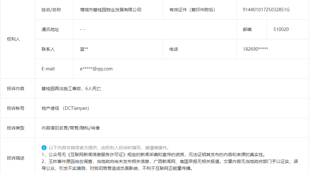 后来地产透视发来了一条信息,被碧桂园恶意投诉了。看完内容,突然觉得,碧桂园的睁眼瞎投诉都这么积极,自己写稿怎么能偷懒呢,于是坐下码字。