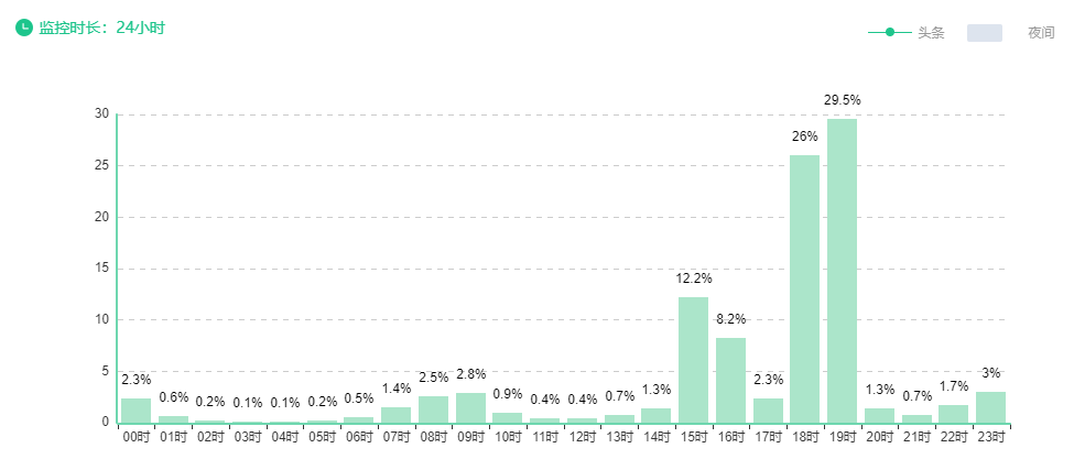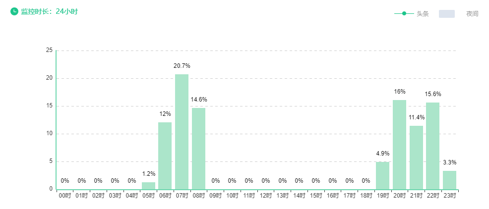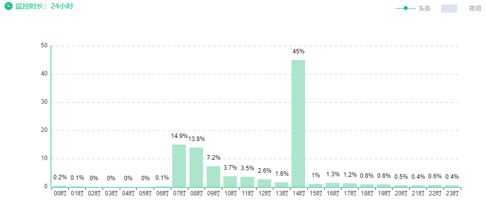 15点发文的,阅读曲线呈锯齿状和断崖式上升状,急剧爬升。再来看看她的阅读时段分布: