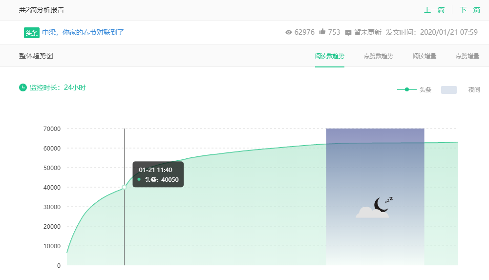 这也是正常的阅读曲线,因为发文时间是22点,渡过了睡眠时间后,第二天6-12点,阅读量曲线又平滑向上爬升。