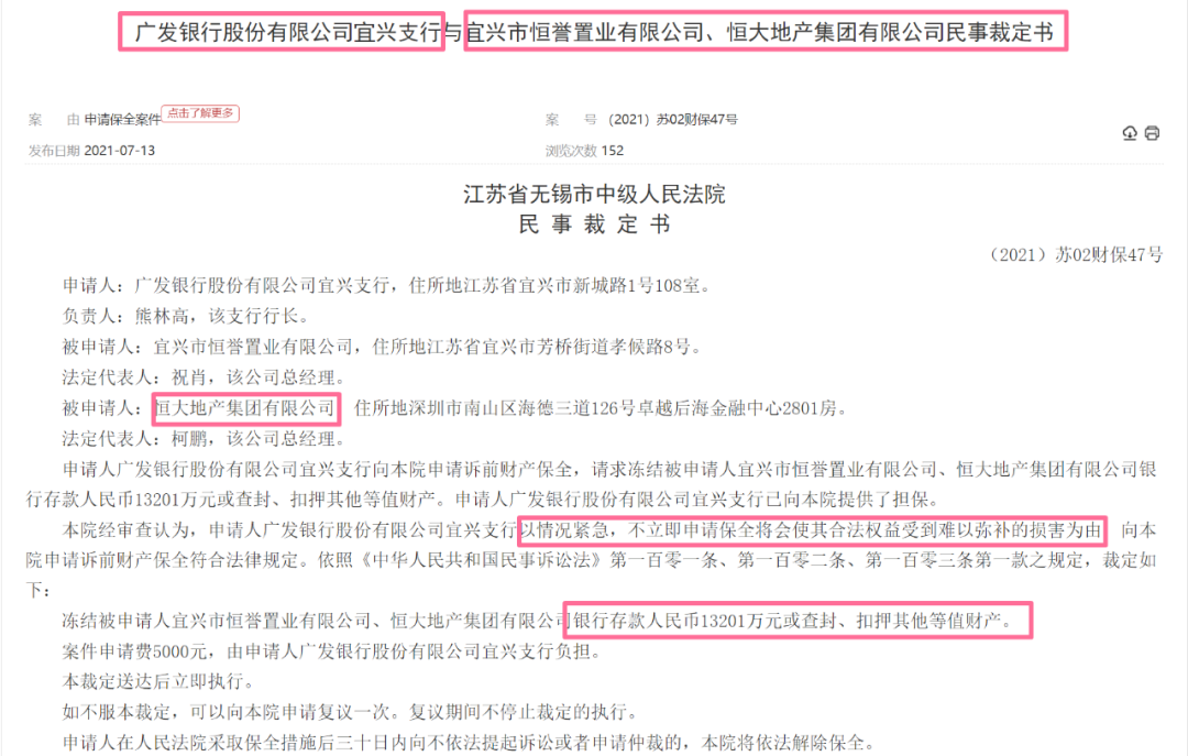 随后,恒大集团发声明称,旗下项目公司与广发银行宜兴支行项目贷款1.32亿元到期日为明年3月27日;对于该行滥用诉讼前保全的行为,将依法起诉。