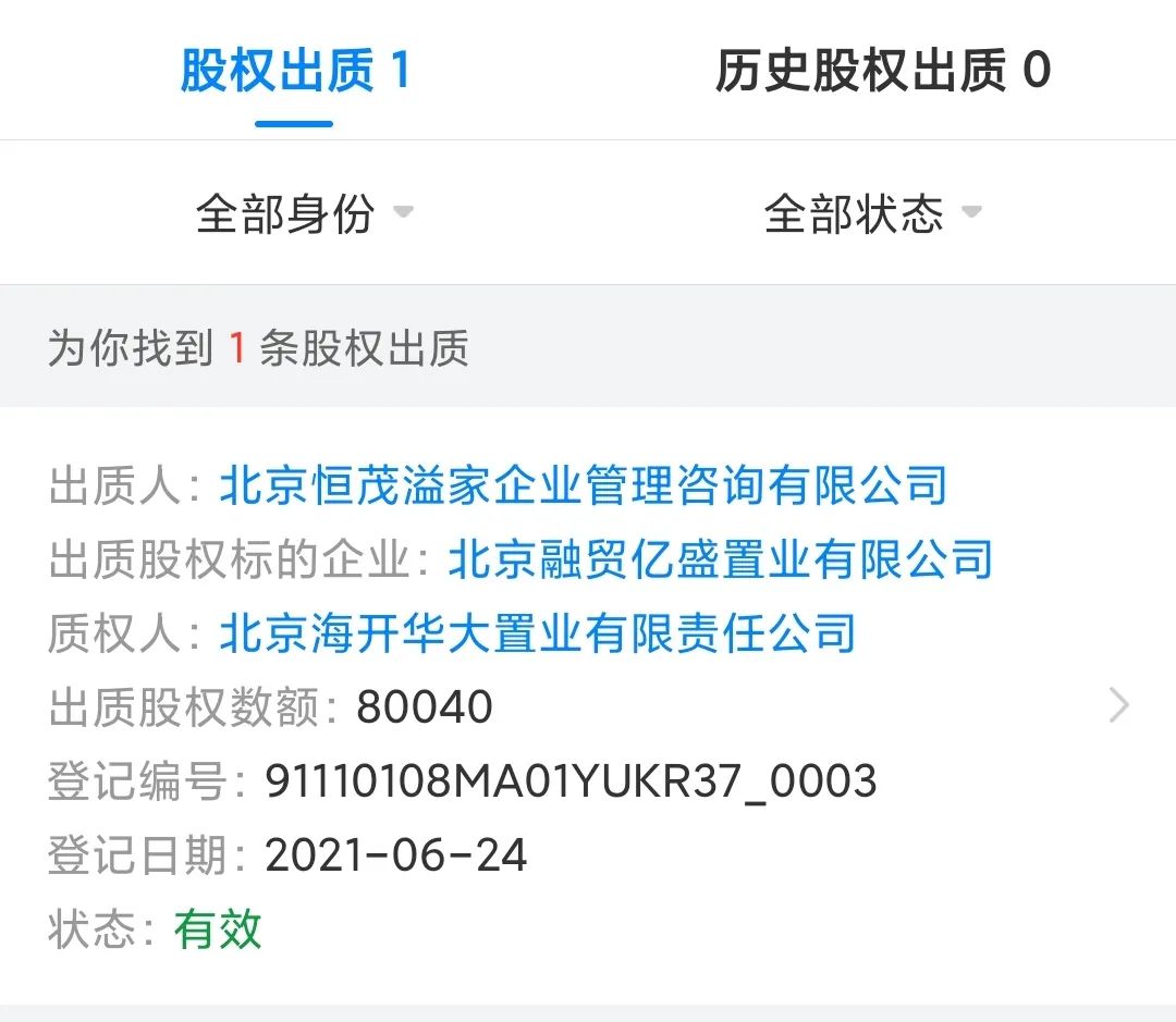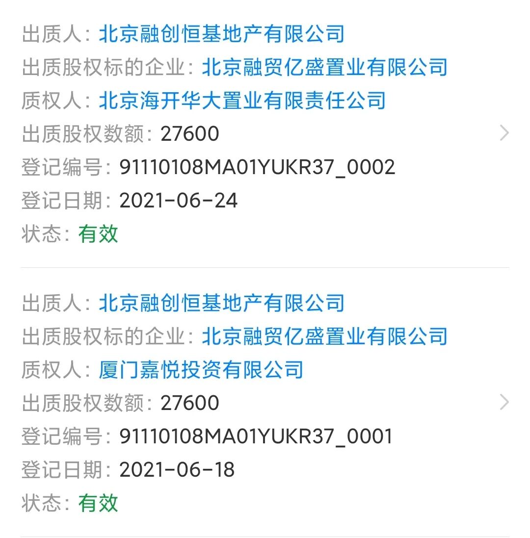 三股东融创,分别将股权质押给了厦门嘉悦投资有限公司和北京海开华大置业有限公司,前者和后者的实控人,分别是厦门国贸和海淀区国资委。
