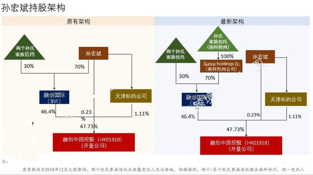 2018年12月31日,孙宏斌又将所持融创总股份约32.47%,总价值约321亿的股票,转入了设在美国南科他州的离岸家族信托,受益人是孙宏斌及其家庭成员。至此,孙宏斌所持融创几乎全部股份都装入了孙氏家族信托。