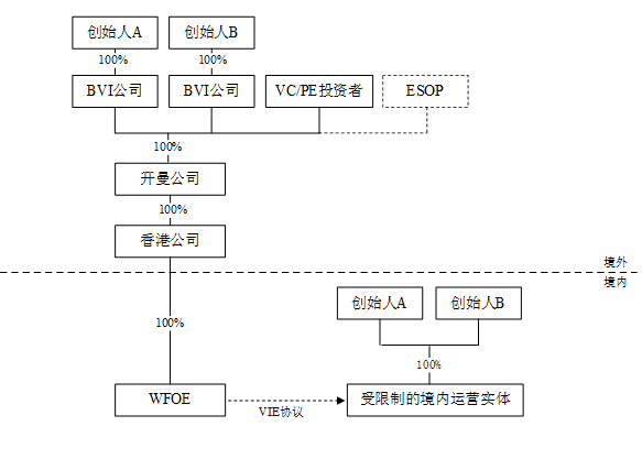 然后在境外搭建架构,即公司股东在境外设立一系列的BVI公司、开曼公司、香港公司((香港公司的设立主要为了税收优惠),以及WOFE(外商独资企业)。