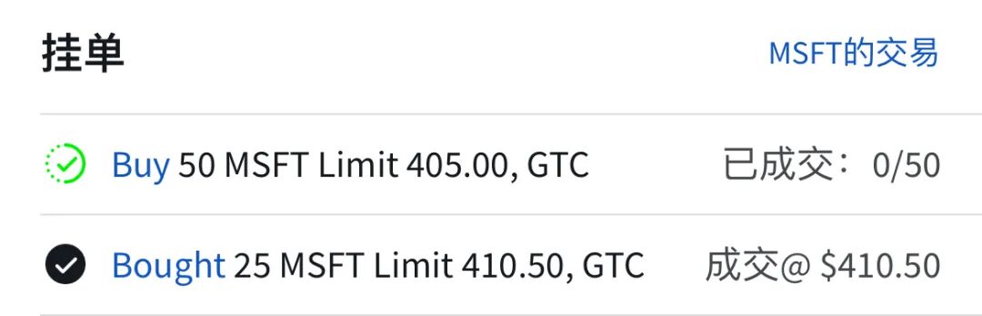 微软跌了3.59%,428美元,盘前一度跌到410.02美元,我在410.5美元成功加仓: